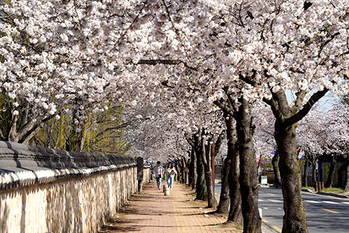천마총으로 유명한 대릉원 옆 돌담길도 봄이면 벚꽃길로 변합니다.