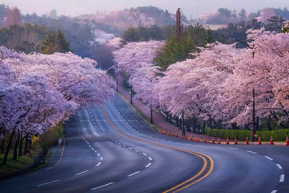 경주월드 테마파크 입구로 이어지는 도로 양옆이 벚꽃으로 뒤덮입니다.