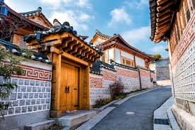 전통 한옥이 줄지어 있는 고즈넉한 마을입니다.