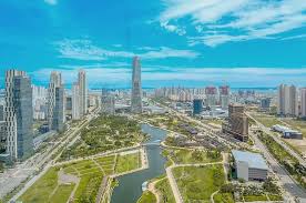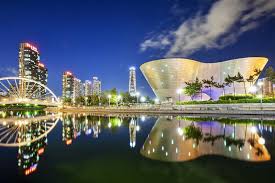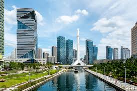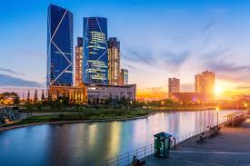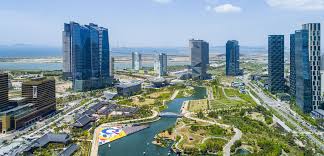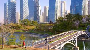 고층 빌딩 사이 인공수로가 흐르는 도시형 공원이에요.