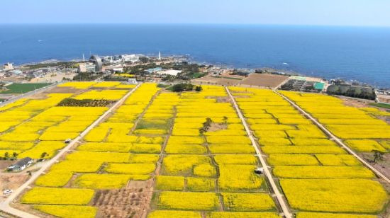 해안선을 따라 유채꽃이 이어져 푸른 바다와 노란 꽃의 대비가 환상적입니다.